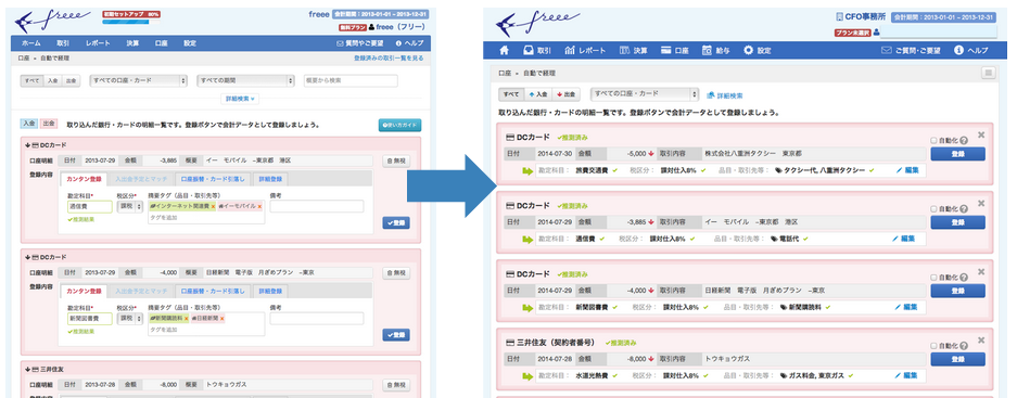 また、外部ツールとの連携も、freeeは当初よりオープンなAPIを提供することで積極展開をしているが、2014年には新しく18 の連携も追加し、銀行やクレジットカード明細との連携以外にも幅広い自動化が大きく進捗した。リクルート社のPOSレジアプリ「AirREGI」や、スマホ決済の「square」、Google Apps 連携などは特に好評だが、請求書ソフト、ECプラットフォーム、決済代行、税務ソフト等さまざま連携が広がっている。