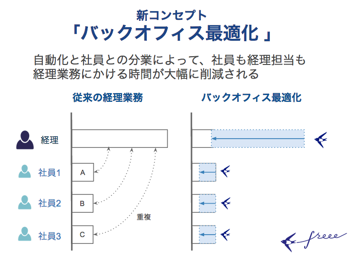このように、単に会計ソフトへの記録をラクにするという発想ではなく、経理周辺の業務プロセス自体を大幅に改善し、小さなビジネスのメンバー全員がより効率的に働ける環境をつくろうというコンセプトがfreeeの掲げる「バックオフィス最適化」の趣旨である。