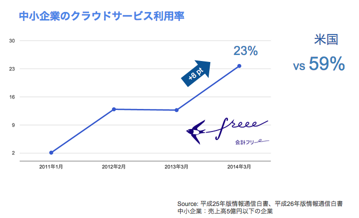 最後は外的要因ともいえるが、freee がリリースされた 2013年3月から2014年の3月にかけて、日本の中小企業におけるクラウドサービス利用率が15%から23%へ 8 ポイントもアップした。(平成25年・平成26年通信利用動向調査より、売上5億円以下の企業対象)