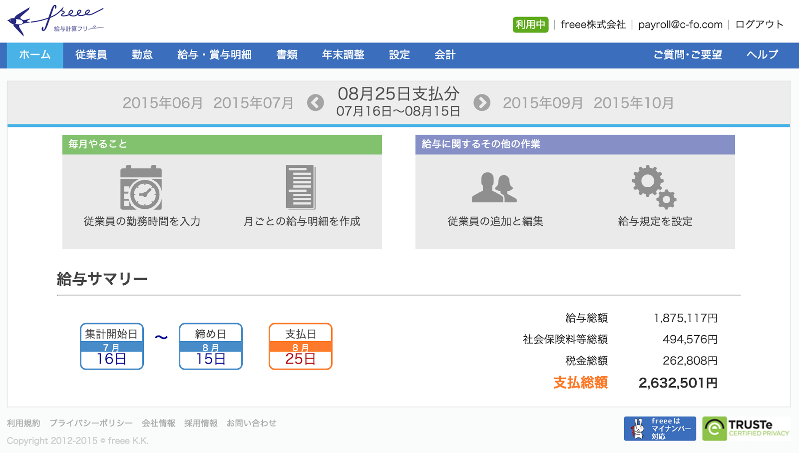 2015年6月には、会社設立 freee をリリース。このプロダクトの原案は、昨年の社員合宿(オフサイト)からあがってきたものであるが、確定申告後の次の一手として、全社戦略に合致するものであったことから、すぐにプロジェクトチームを結成し、短期間でのリリースにいたった。リリースは非常に大きな成功を納め、freee はスモールビジネスの誕生を支援し(会社設立)、日常を支援し(経理)、成長を支援する(給与計算)バリューチェーンを構築することができた。(関連記事)