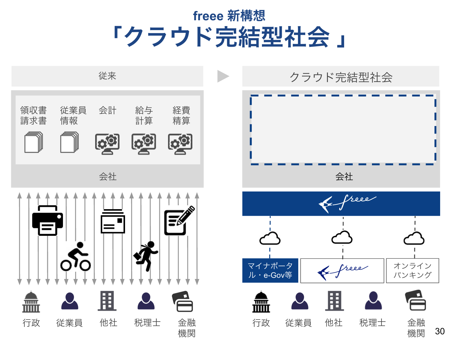 これまで、ビジネスのバックオフィスの現場では、どうしても書面でのやりとりが必要になっていた。これは行政の仕組みや法規制によるものが大きかった。例えば、従業員が入社した際には行政に対して多くの書面手続きが必要であるし、領収書や請求書は紙で保存される必要があった。ところが、これらが政府の電子化の政策により大きく変わってくる潮目にある。その中で freee は、クラウド完結型社会の実現というコンセプトを掲げ、これにコミットしている。行政の手続きや、書類の保存などバックオフィスにおけるすべての部分において、 freee からクラウドで完結できる社会の実現である。(関連記事)